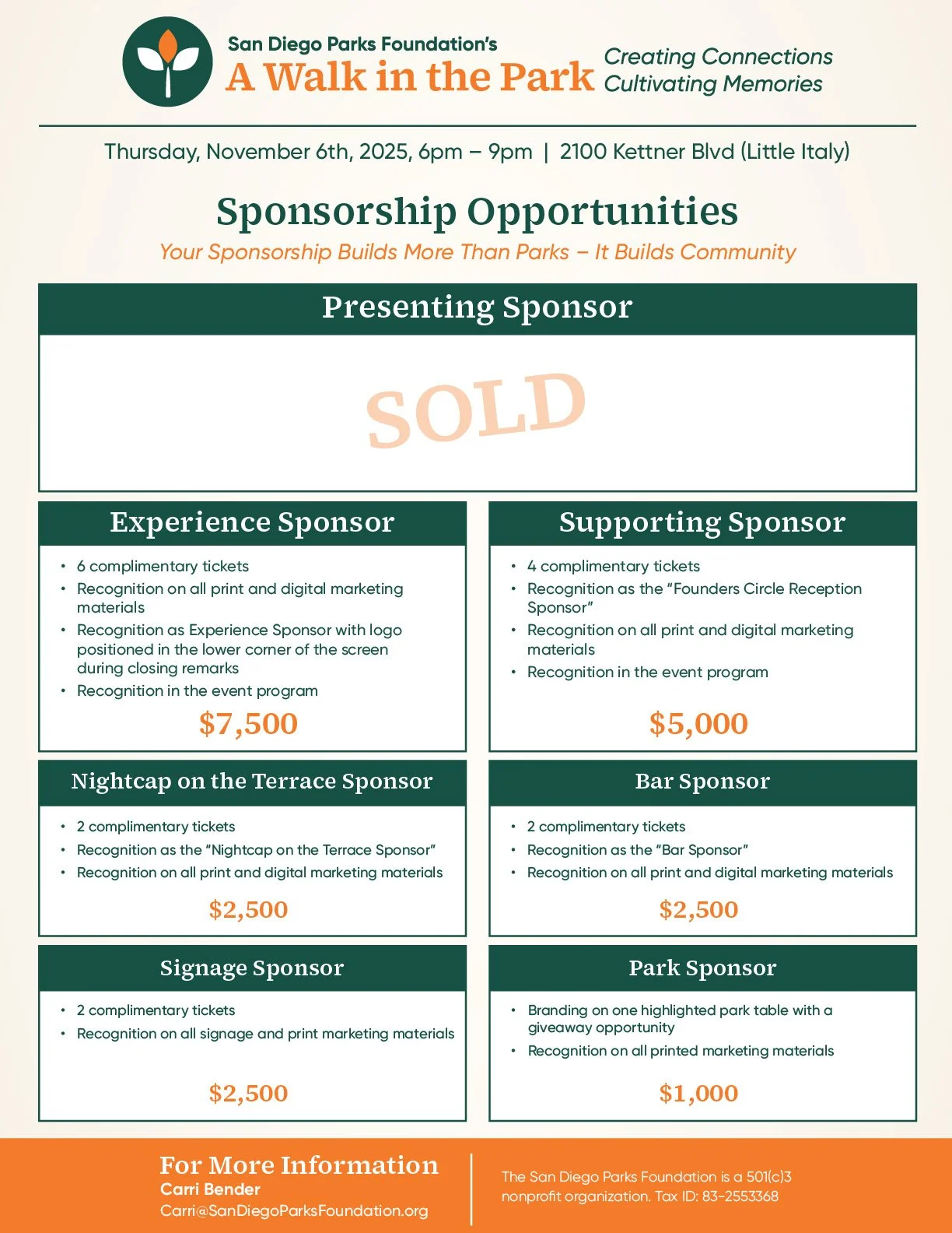 “Walk in the Park 2025” is a signature fundraising event by the San Diego Parks Foundation. Guests enjoy an immersive evening with park-themed cuisine, cocktails, live entertainment, and guided tours through some of San Diego’s most historic and vibrant parks. All proceeds support local park improvements and community programs.